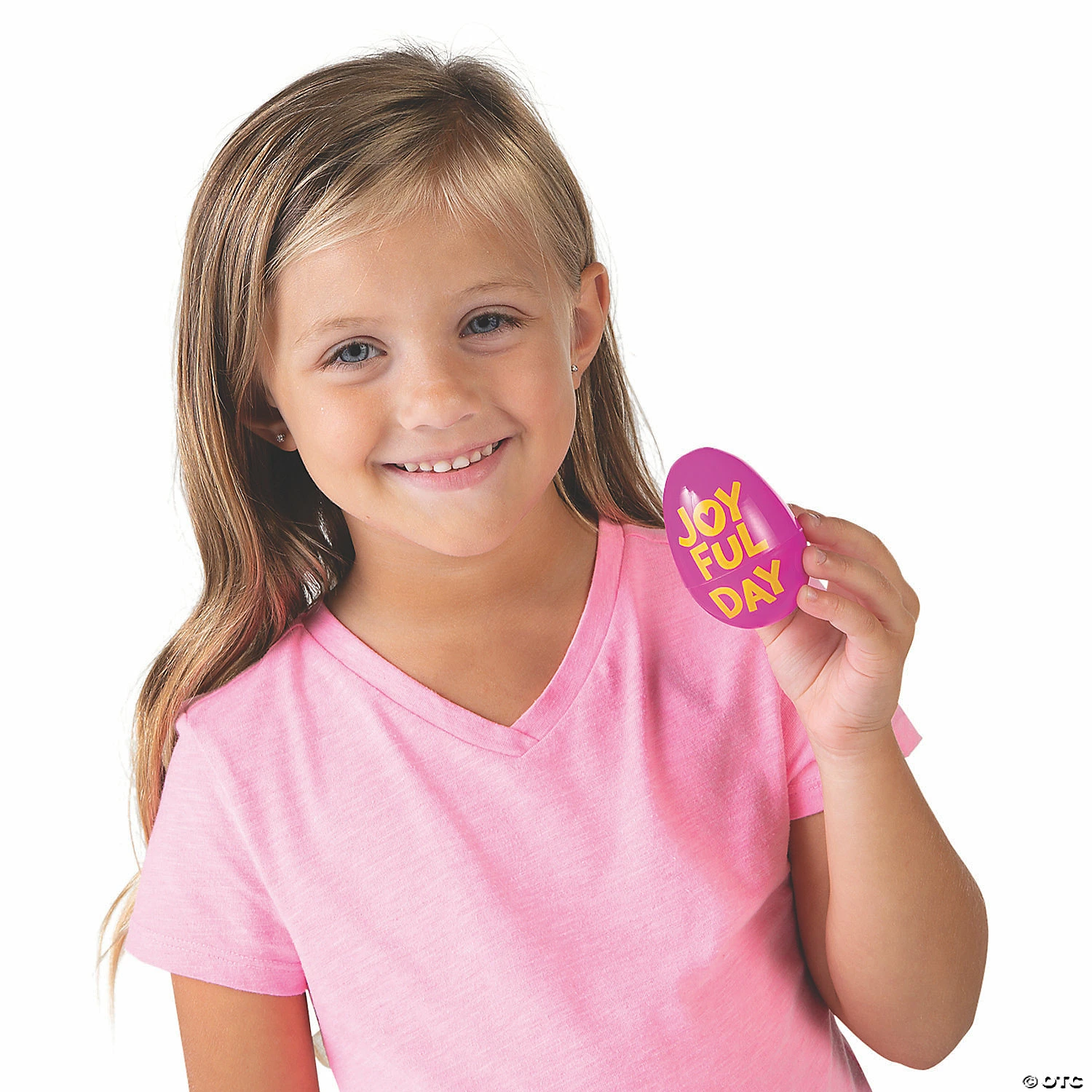 Surprise kids with these pre-filled Easter eggs! The assorted color plastic eggs are printed with “Joyful Day” and include religious prism toys. Pass out the Easter eggs as Sunday School giveaways or add them to your church egg hunt supplies for a fun candy alternative! The jumbo eggs are extra fun to hunt! Plastic. (2 dozen per unit) Egg, 3″; prism, 1 1/2″. © OTC