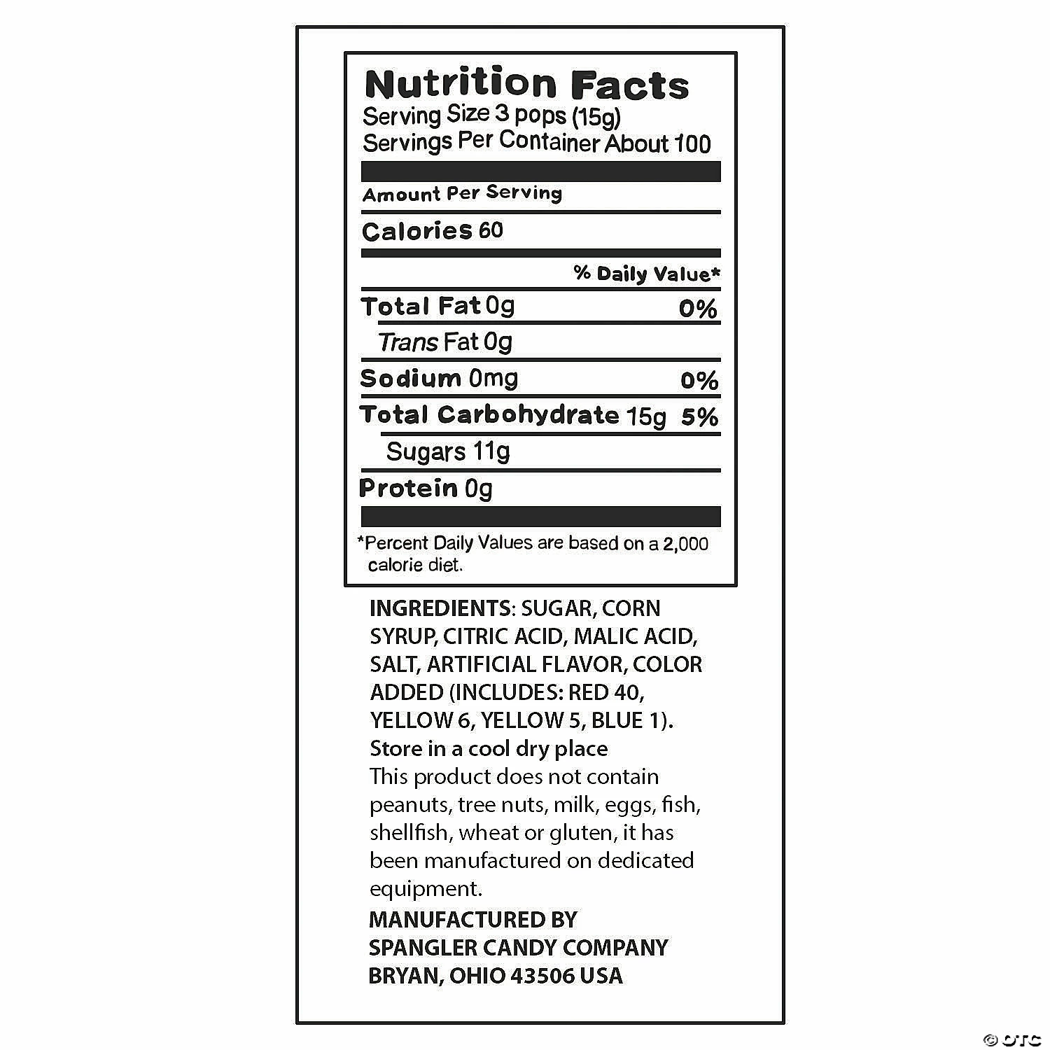 Seeking a classic taste? Check out these name-brand suckers that we all recognize, remember and love! Put these classic suckers in party goody bags or gift baskets. Perfect for your Halloween candy stash, this candy can also be put into Christmas stockings or Easter baskets for an extra treat! Assorted flavors. Individually wrapped. (300 pcs. per unit) Total wt., 50 oz. © Spangler Candy Company• Fat-free.• Nut-free. • Dairy-free.• Gluten-free.• Kosher (Pareve). • Made in the USA, Important Country of Origin Information: For certain items sold by OTC on our Web or Mobile sites, country of origin information can change and what is displayed may not be accurate or consistent with manufacturer information. For up to date country of origin information, it is recommended that you rely on product packaging or other manufacturer information.• Ingredient, nutrition, allergen and other product information are provided on our Web and Mobile sites for reference purpose only, without warranty or representation as to accuracy. Manufacturers adjust their labeling regularly and are solely responsible for the accuracy of the information. For general questions concerning these items, please contact our customer service at 800-228-0475.