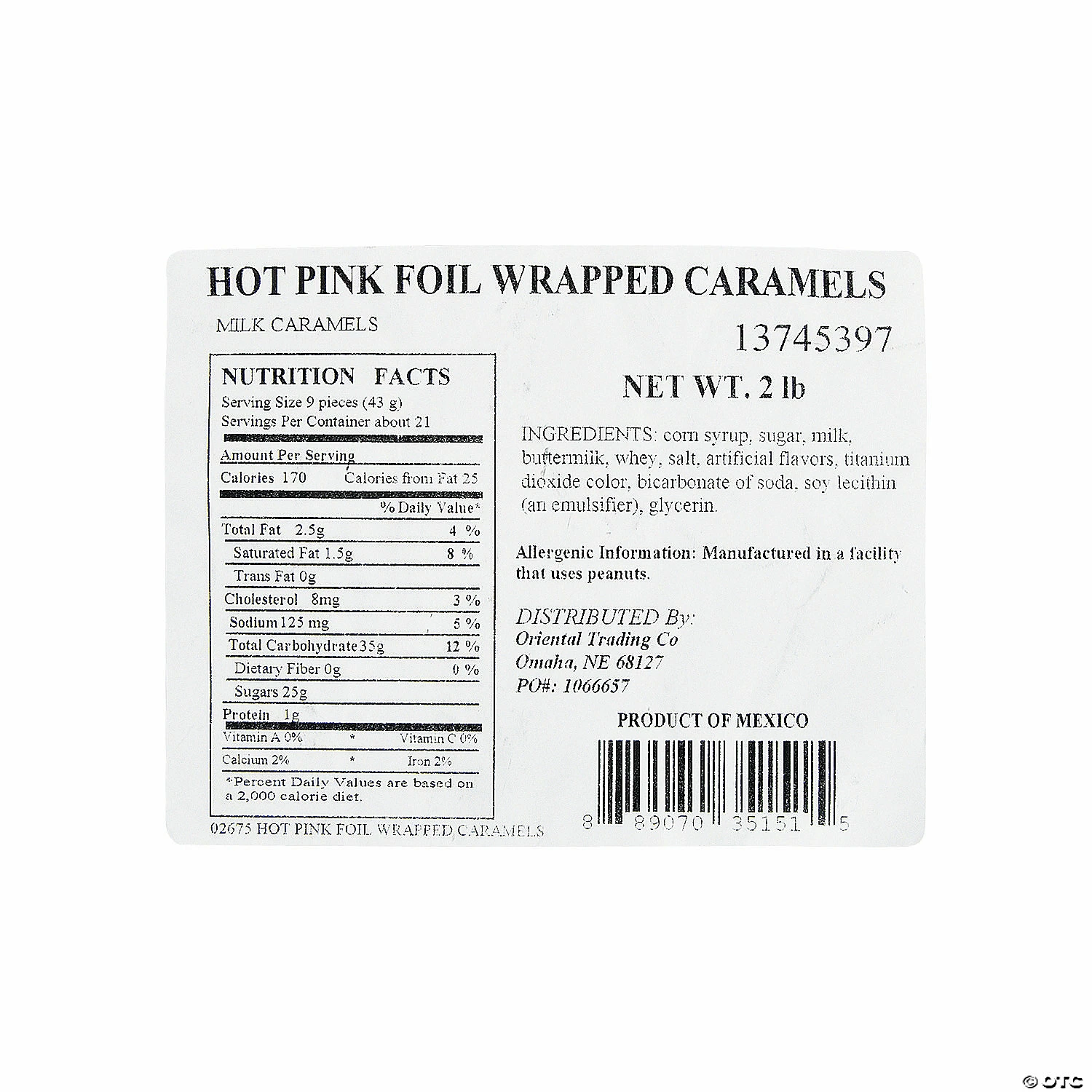 Are you looking for a sweet addition to your party supplies? Unwrap true happiness with these Foil-Wrapped Caramels. Perfect for any and every special celebration, these caramel treats will look absolutely fabulous in a candy buffet. Perfect for wedding receptions, birthday parties, holiday celebrations and so many more big occasions! Individually wrapped. (Approx. 189 pcs. per unit) Total wt., 2 lbs.โข Candy is non-returnable. For more information, visit our โReturn Policyโ page located on our website.โข Ingredient, nutrition, allergen and other product information are provided on our Web and Mobile sites for reference purpose only, without warranty or representation as to accuracy. Manufacturers adjust their labeling regularly and are solely responsible for the accuracy of the information. For general questions concerning these items, please contact our customer service at 800-228-0475.