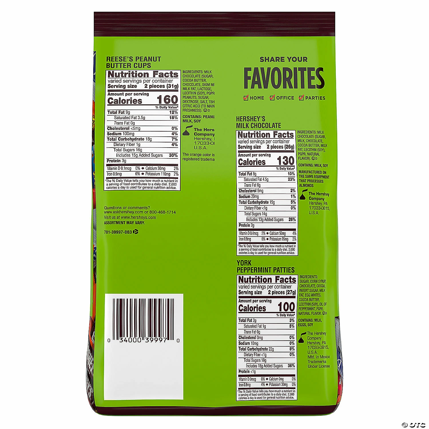 A 33.43 oz stand up bag assortment of snack sized Hershey’s Mini Milk Chocolate Bars, York Dark Chocolate Peppermint Patties, Reese’s Peanut Butter Cups, Almond Joys, and Milk Chocolate Kit Kats. Whether you’re in the mood for minty dark chocolate, crispy milk chocolate wafers, peanut butter or just pure chooclate this bag has something for everyone. Bring to your next holiday party or pack in the kids lunches for a surprise they’ll love! Special Shipping Information: This item ships separately from other items in your order. This item cannot ship to a P.O. Box. This item may be subject to additional processing days. ITEM IS NOT ELIGIBLE FOR EXPEDITED SHIPPING
