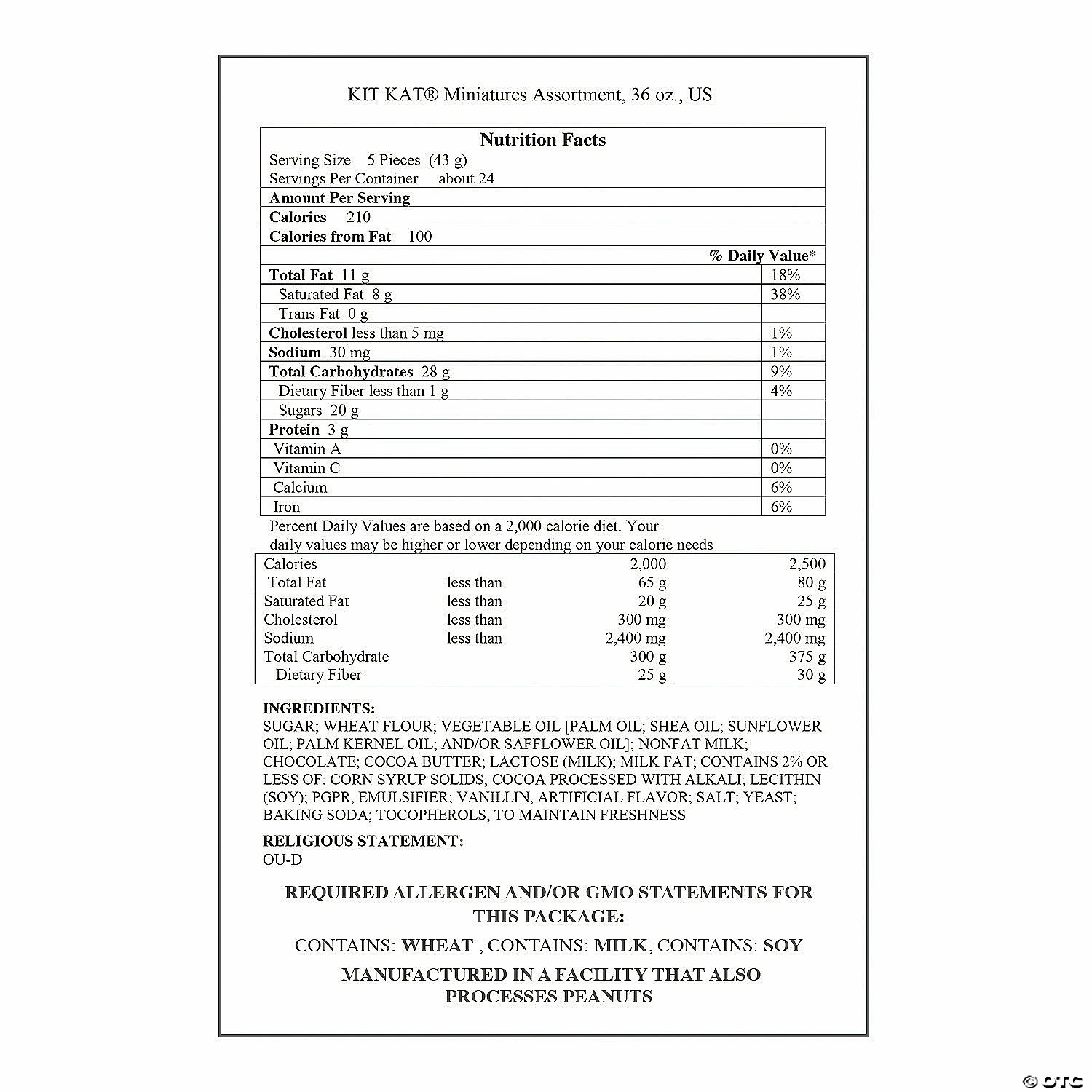 Give yourself a break and pick up this awesome KitKat® Miniatures Assortment! It includes three yummy varieties of the name-brand favorite: milk chocolate, white crème and mildly sweet dark chocolate. You can give the sweets away to Halloween trick-or-treaters, in Easter eggs, or in a Valentine’s Day candy exchange. With something for everybody, this is a must-have Halloween party candy assortment. Individually wrapped. (120 pcs. per unit) Total wt., 32.1 oz. Kosher. Assortment may vary. © The Hershey Company• Gluten.• Kosher.• Candy is non-returnable. For more information, visit our “Return Policy” page located on our website.• Made in the USA. Important Country of Origin Information: For certain items sold by OTC on our Web or Mobile sites, country of origin information can change and what is displayed may not be accurate or consistent with manufacturer information. For up to date country of origin information, it is recommended that you rely on product packaging or other manufacturer information.• Ingredient, nutrition, allergen and other product information are provided on our Web and Mobile sites for reference purpose only, without warranty or representation as to accuracy. Manufacturers adjust their labeling regularly and are solely responsible for the accuracy of the information. For general questions concerning these items, please contact our customer service at 800-228-0475.