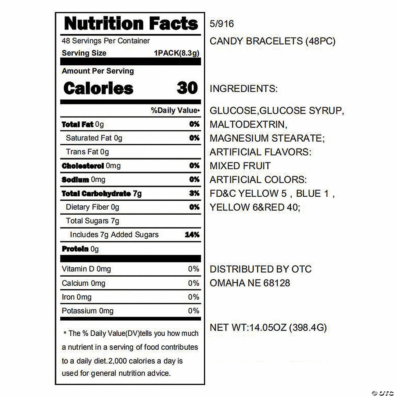 โข What’s Included: This set includes 48 individually wrapped hard candy bracelets. Each has an elastic bracelet ringed in mixed fruit flavored hard candies of various colors. Not for kids under three years old. โข Non-Returnable: Candy is non-returnable. For more information, visit the Return Policy page located on our website.โข Important Country of Origin Information: For certain items sold by OTC on our Web or Mobile sites, country of origin information can change and what is displayed may not be accurate or consistent with manufacturer information. For up to date country of origin information, it is recommended that you rely on product packaging or other manufacturer information.โข Product Information: The candy bracelets are fat-free. Details about ingredients, nutrition, allergens and other product information are provided on our Web and Mobile sites for reference purpose only, without warranty or representation as to accuracy. Manufacturers adjust their labeling regularly and are solely responsible for the accuracy of the information. For general questions concerning these items, please contact our customer service at 800-228-0475.Product Description: A candy classic! Wear your candy on your sleeve with these stretchable hard candy bracelets. A stretchy elastic bracelet is ringed with fruity flavored hard candy pieces in assorted colors. They’re as cute to wear as they are tasty! The set includes 48 bracelets that are individually wrapped so are perfect for giving out at Halloween and trunk-or-treat events plus adding into Easter baskets, birthday party favor bags and Christmas stockings. Kids of all ages will happily wear and eat these candy bracelets. Specs:Size: 2 1/2″Quantity: 48Dietary needs: Fat-freeBrand: ยฉ OTC – Oriental Trading Company