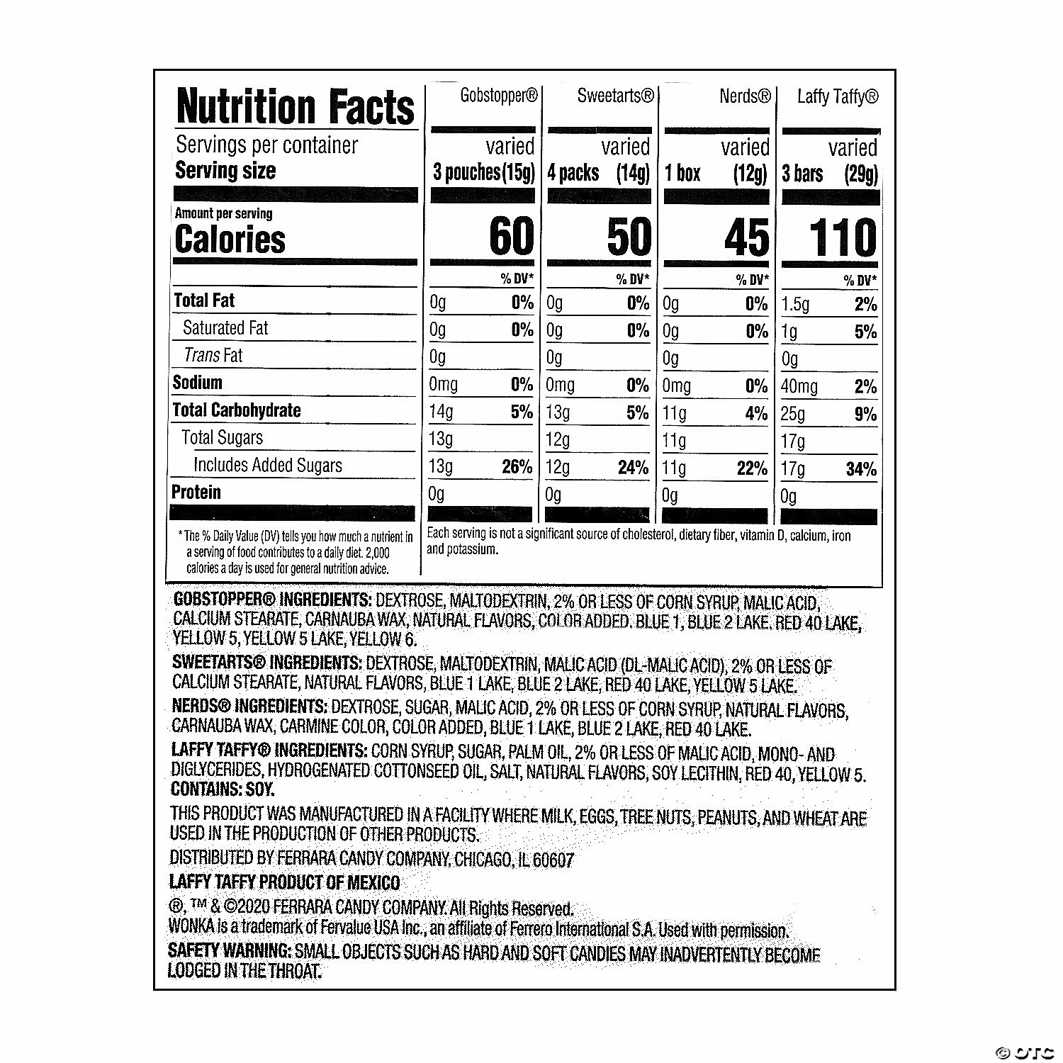 Fill piñatas, Easter baskets, May Day baskets or party favor treat bags with these assorted Wonka™ candy favorites. With plenty for the whole candy-craving crew, this Wonka™ Mix-Ups® Candy Assortment will satisfy even the biggest sweet tooth! These sweet treats are great to use as Christmas stocking stuffers or trick-or-treat and Trunk or Treat giveaways, too! • Includes assorted Wonka™ candy favorites like Nerds® candy, Gobstoppers®, SweeTarts®, and Laffy Taffy®.• Individually wrapped.• (Approx. 150 pcs. per unit) • Total wt., 3 lbs.• Assortment may vary.• Fat-free• Candy is non-returnable. For more information, visit our “Return Policy” page located on our website.• Made in the USA. Important Country of Origin Information: For certain items sold by OTC on our Web or Mobile sites, country of origin information can change and what is displayed may not be accurate or consistent with manufacturer information. For up to date country of origin information, it is recommended that you rely on product packaging or other manufacturer information.• Ingredient, nutrition, allergen and other product information are provided on our Web and Mobile sites for reference purpose only, without warranty or representation as to accuracy. Manufacturers adjust their labeling regularly and are solely responsible for the accuracy of the information. For general questions concerning these items, please contact our customer service at 800-228-0475.